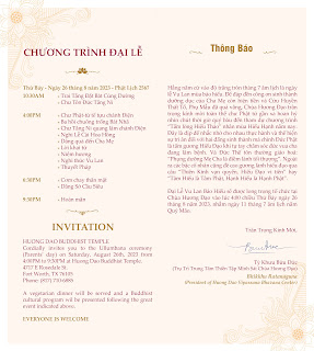 Chùa Pháp-Quang tổ chức lễ vào Chủ Nhật hồi 11:AM ngày 27, tháng 8, 2023. Chùa đã được thầy Thích Trí Hiền tạo lập trước khi tôi dọn tới Grand-Prairie. Tôi được biết thầy khi tới chùa lúc đó chỉ mới có chùa nhỏ là căn nhà trên đường ra cổng ngày nay. Lúc đó tôi còn trẻ, đưa các cháu tới chùa gia nhập Gia-đinh Phật-tử. Tôi cũng tham gia dạy tiếng Việt cho các cháu.